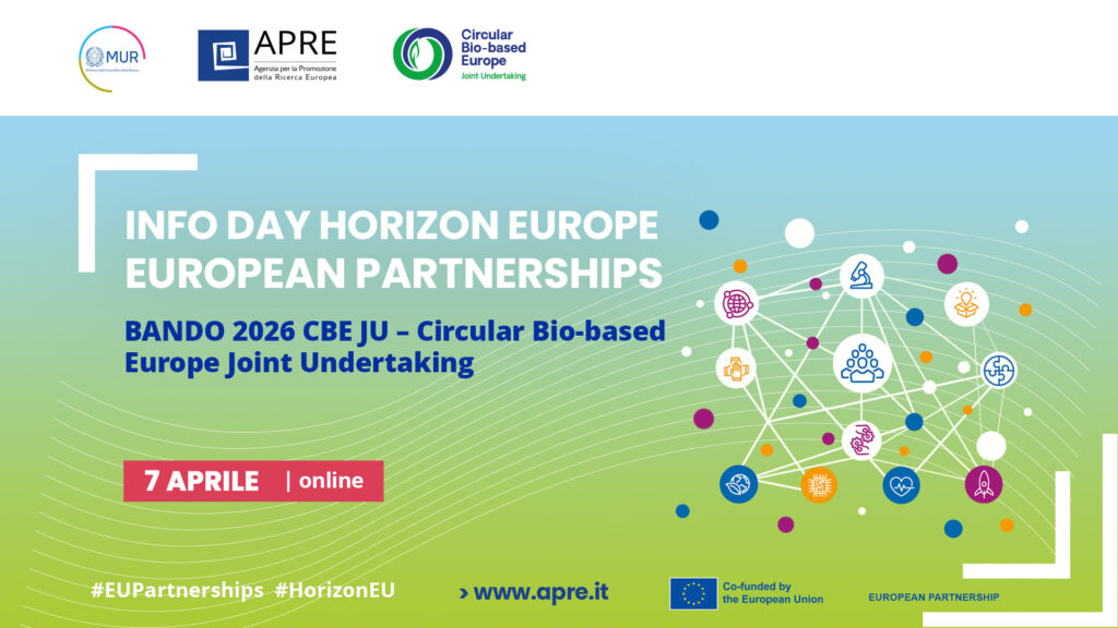 | APRE, in accordo con il MUR e in collaborazione con partenariato CBE JU, organizza online la mattina del 7 aprile (h.11:00-13:00) l’evento nazionale “INFO DAY HORIZON EUROPE – EU PARTNERSHIPS | Bando 2026 CBE JU – Circular Bio-based Europe Joint Undertaking”. La partecipazione all’Info day, libera, previa registrazione, è aperta a tutte le persone interessate ai nuovi bandi. È possibile registrarsi attraverso il form dedicato nella pagina ufficiale dell’evento cliccando sul bottone sottostante. |